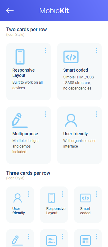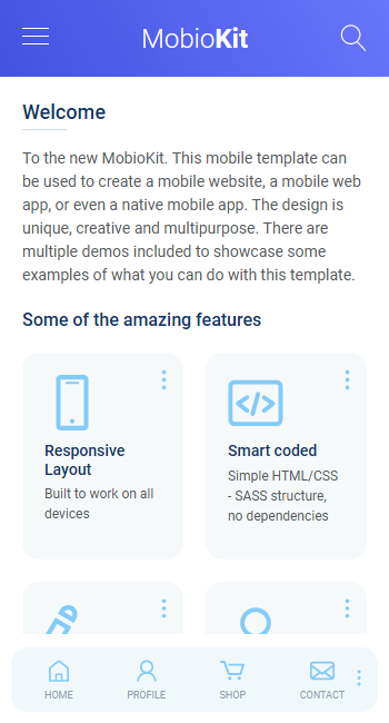 MobioKit is an HTML mobile template that will give you the perfect starting point in creating the layout design of your mobile website, mobile web app and mobile native app. The creative design and the amazing features will be perfect in making your mobile project unique. This mobile UI Kit includes all the necessary designs to create a mobile shop, a mobile social app, a mobile fitness app, a business related mobile app, and with a bit of imagination from your side on any mobile project.
